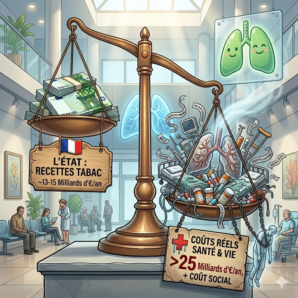On entend souvent : « L’État s’en met plein les poches avec les taxes ! ». C’est vrai, les taxes rapportent gros (environ 80% du prix du paquet). Le problème ? Ce que le tabac rapporte à l’État est largement grignoté par ce qu’il lui coûte. Soins de santé : les cancers, les maladies cardio-vasculaires et respiratoires coûtent une fortune à la collectivité. Bilan : Pour 1 € de taxe perçu, le tabac coûte en réalité près de 3 € à la société en dépenses de santé et perte de productivité. Personne n’est gagnant !